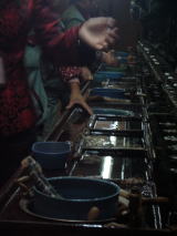 10個の繭から引いた生糸繊維を、1本の糸にして、また10本、また10本と撚り合わせて、いきます。