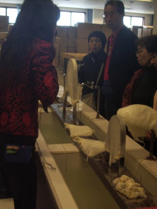 ツアーガイドのわんさんも 「シルクは生きものです。」「大切に使えば、一生使えます。」 「洗うときは部分洗いです。化学洗剤とドライクリーニングはだめですよ。」