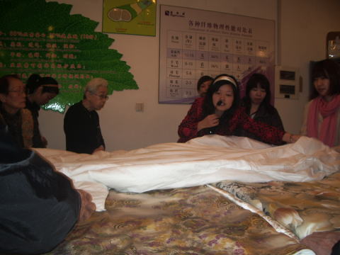 中綿がシルクの掛け布団¥600元(約1万円)、参加者のうちカップルの過半は、ちらほらとご購入。