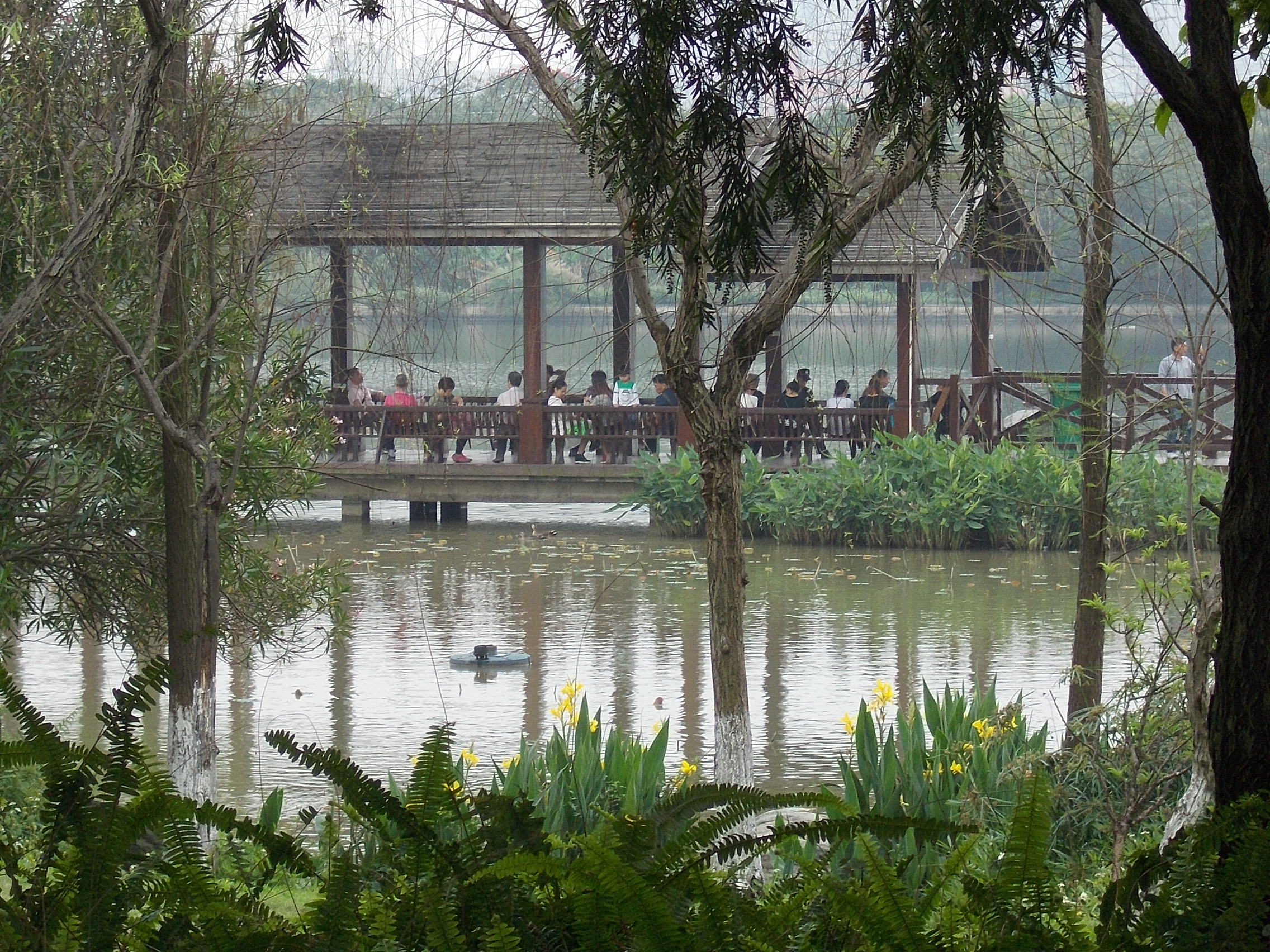歩き始めて約2時間。駅と反対側の天女湖畔に到達したら、そこで驟雨となった。