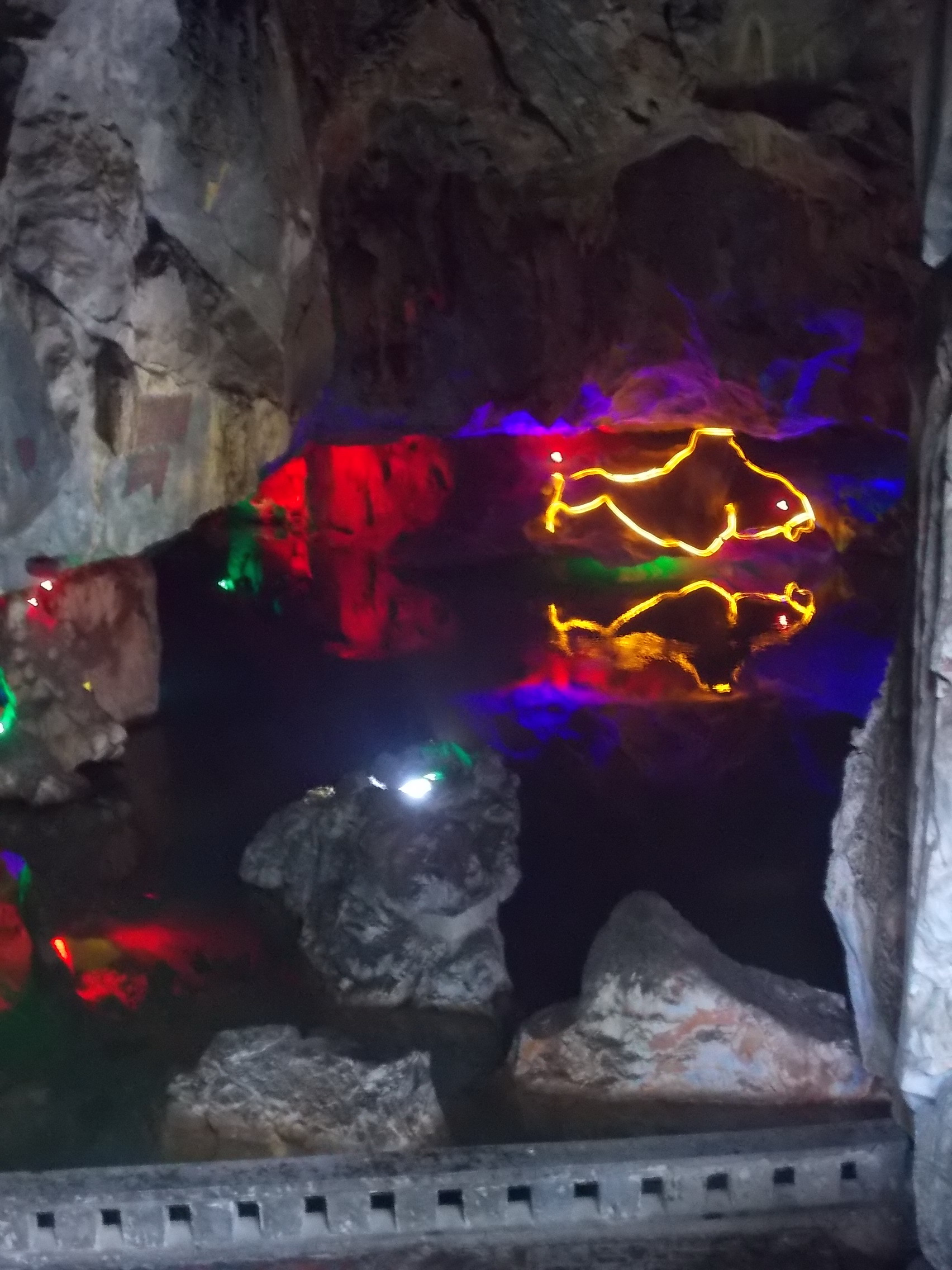 「龍岩洞」は百数mの洞窟の底にある池。人や動物形の岩が電飾され、水面に反射されて幻想的。