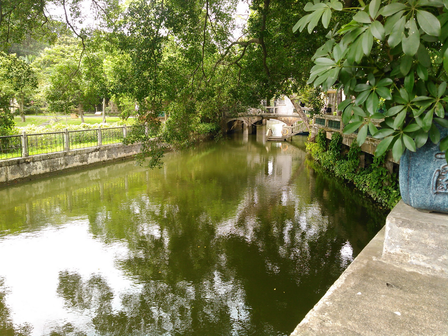 ↑ 運河と橋 鉢植えや橋の柱にも「立園」と 彫ってある。