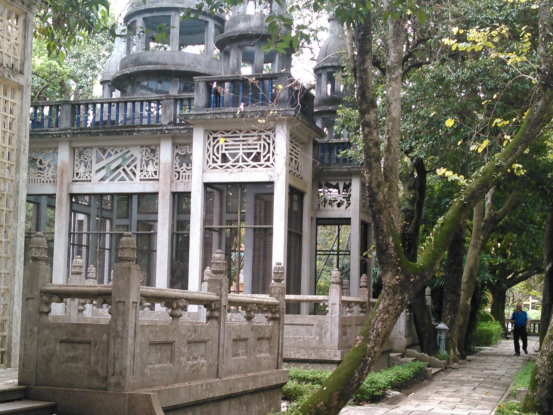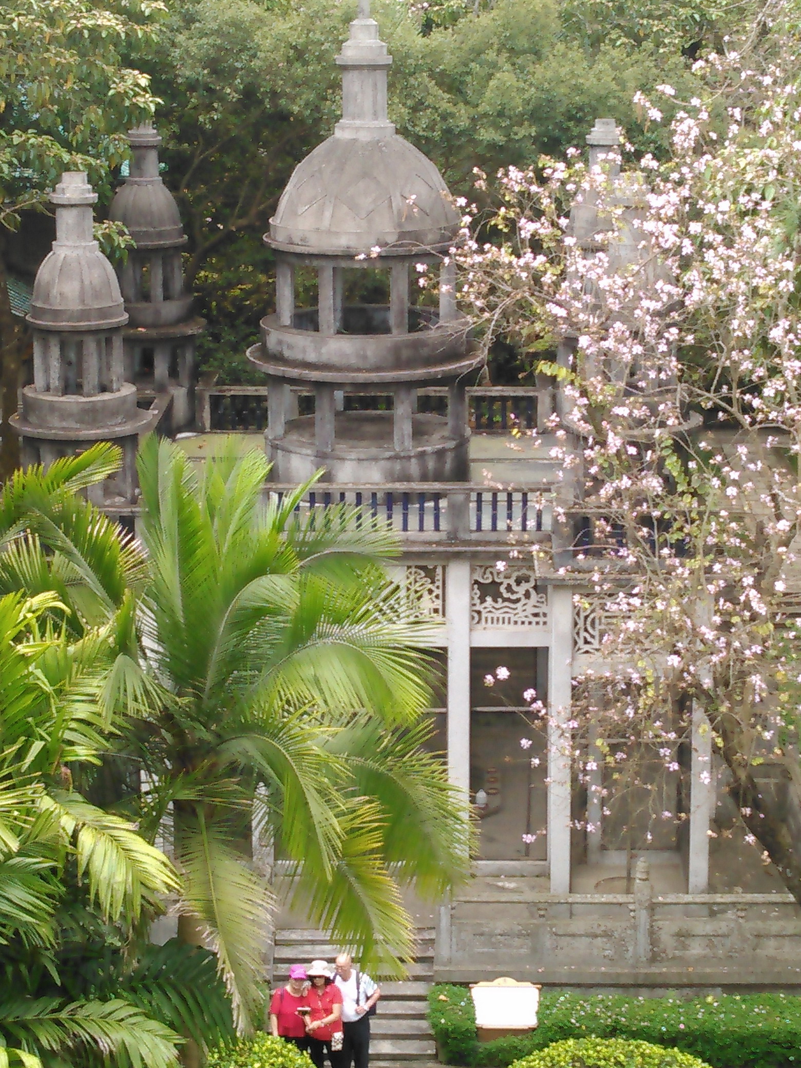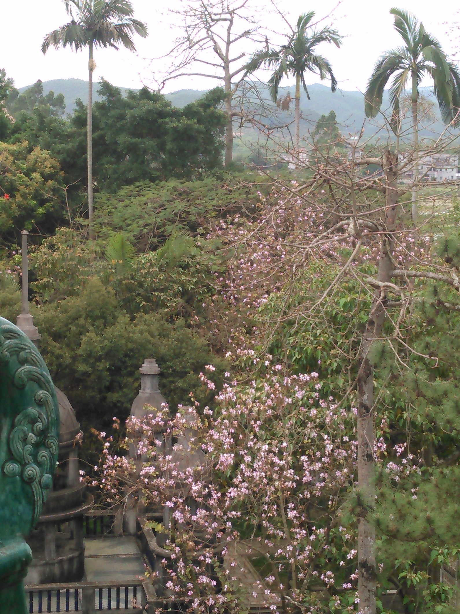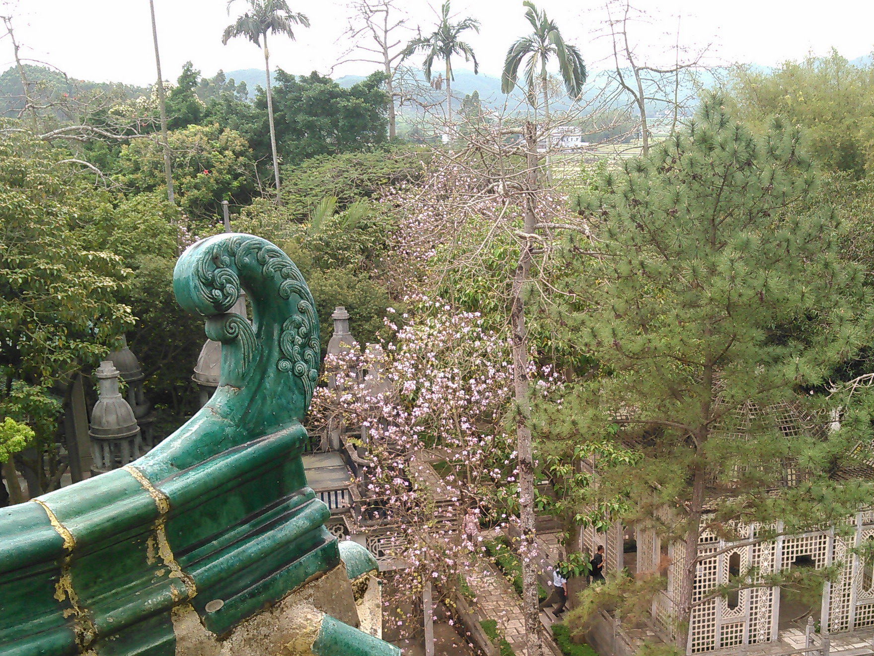 ↑ 「文畔」屋上からの景色 インド的な望楼がついた休憩舎(B)は木々や花で埋まる