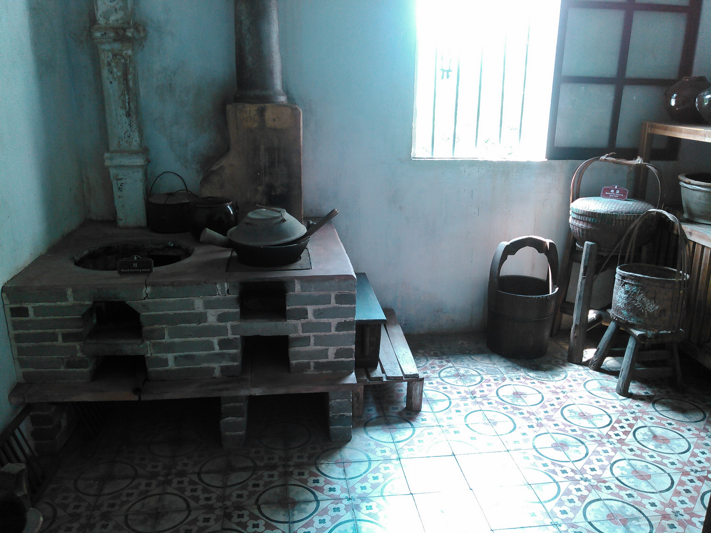 駿蘆3階の居間の近くは、当時のままに釜戸と生活用具が置いてある。
