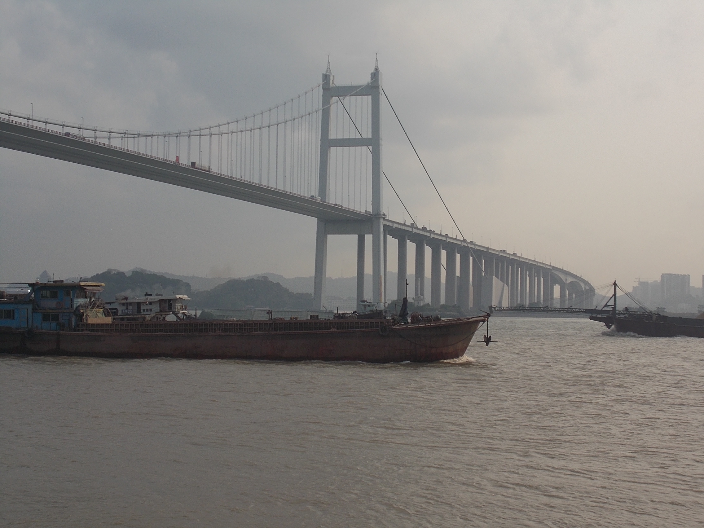珠江大橋 くぐりぬける輸送船が、ひきもきらない