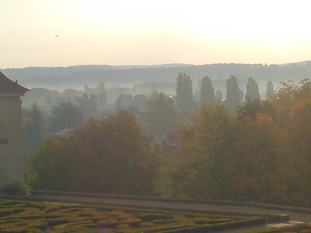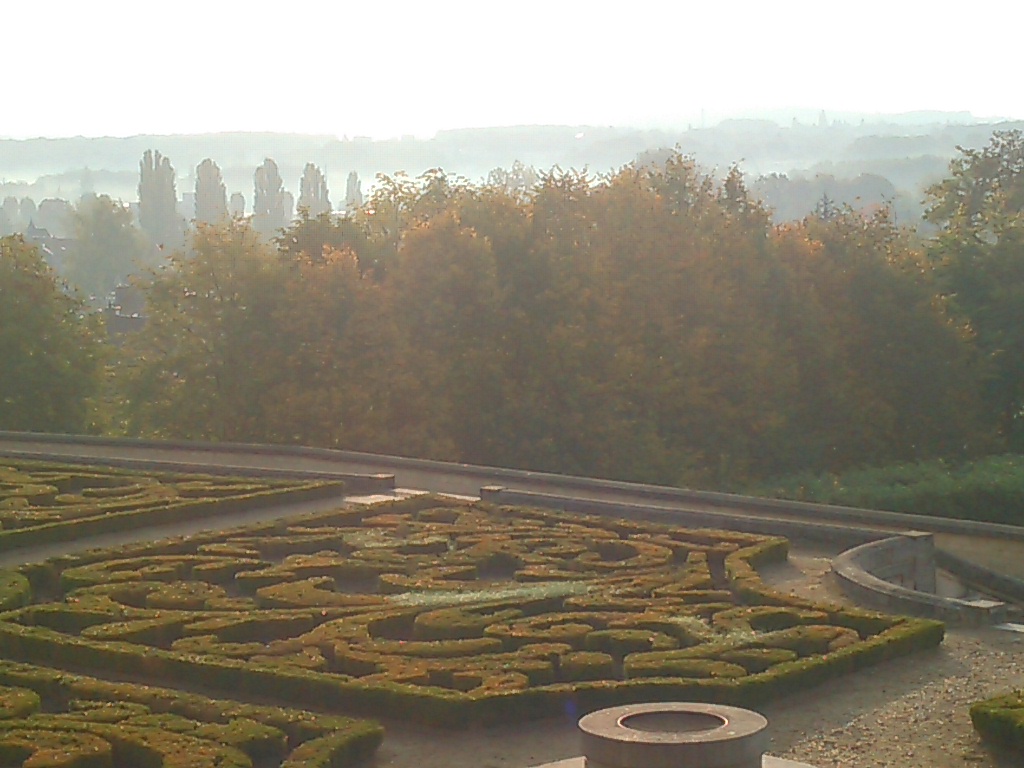 すこし庭園を眺めるテラスに出てみた。そこからの朝霧に沈む城下の景色は、ひとつの観ものだった。