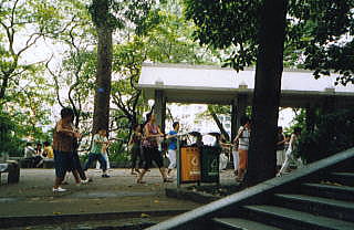 公園全体が小高い山になっている。 後ろ向きに歩いているのは健康法らしく、登って行く人も多い。