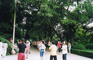 左右にある広場では、それぞれの朝のひととき、健康的に過ごす日課のグループであふれている。