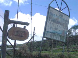 | 午後、Berungbang 山からの帰り道で トレッキングスタート地点を発見した。 これほど地味な道標では、 外国から参加する人たちには たぶん見つからない。 |