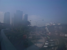 | 3日目の朝、公園地区へわたる陸橋からKL中央駅の方面を見た。 ホテルから歩いた。高い気温と湿度でレンズが曇ってしまった。 |
