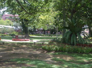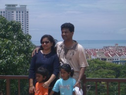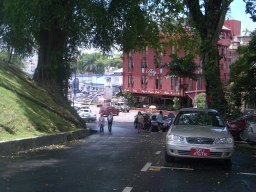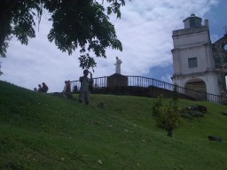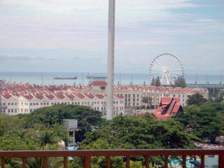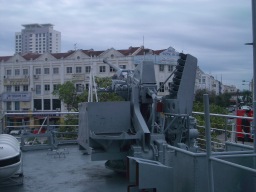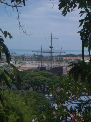 ここからマラッカ海峡を見る。(現在は、ここをセントポールの丘と言う) すぐ隣りにはセントポールや白くまぶしいザビエル教会があった。平和の有難さをなんとなく感じる。 ←(手前は海洋博物館の海賊船) |