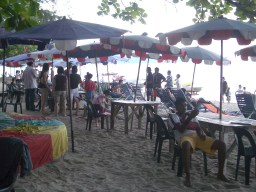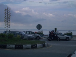 | 夕暮れの北部海岸。 昨日のタクシーの兄ちゃんに教わったとおり、 海岸に面し手前にシーフードが旨い屋台村がある。 行ってみるとマレー独特の素材を使った各種の料理がよりどりで安い。 海産のバーベキューが0.25Rm、焼きそば3.5Rm。 |
