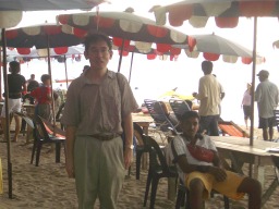 某レポーターの記念ショット。 浜辺で中華系爺さんに撮られた。 (この直前に誰も入らない海で、およいだ。ズボンのしたに海パンはいてるし、 髪の毛はシャワーなし、顔も、服もぐちゃぐちゃ。) |