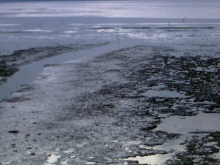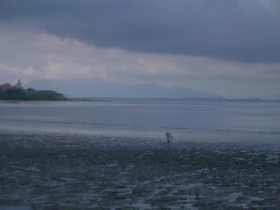 フードコート前の遠浅の砂浜。 よくみると、たくさんの小さなカニ、トビハゼが動き回り、 それをつまみ食いするサギ、シギもいた。 |